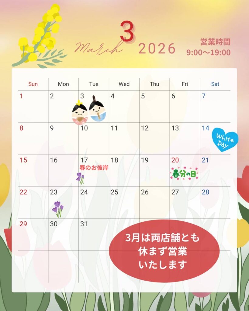 News お知らせ 2026.03.02 3月の営業日 久野店・下堀店とも休まず営業いたします 前の記事へ News一覧へ Category お知らせ Archives 2026年3月 2026年1月 2025年12月 2025年11月 2025年10月 2025年9月 2025年8月 2025年6月 2025年5月 2025年4月 2025年3月 2025年2月 2025年1月 2024年12月 2024年11月